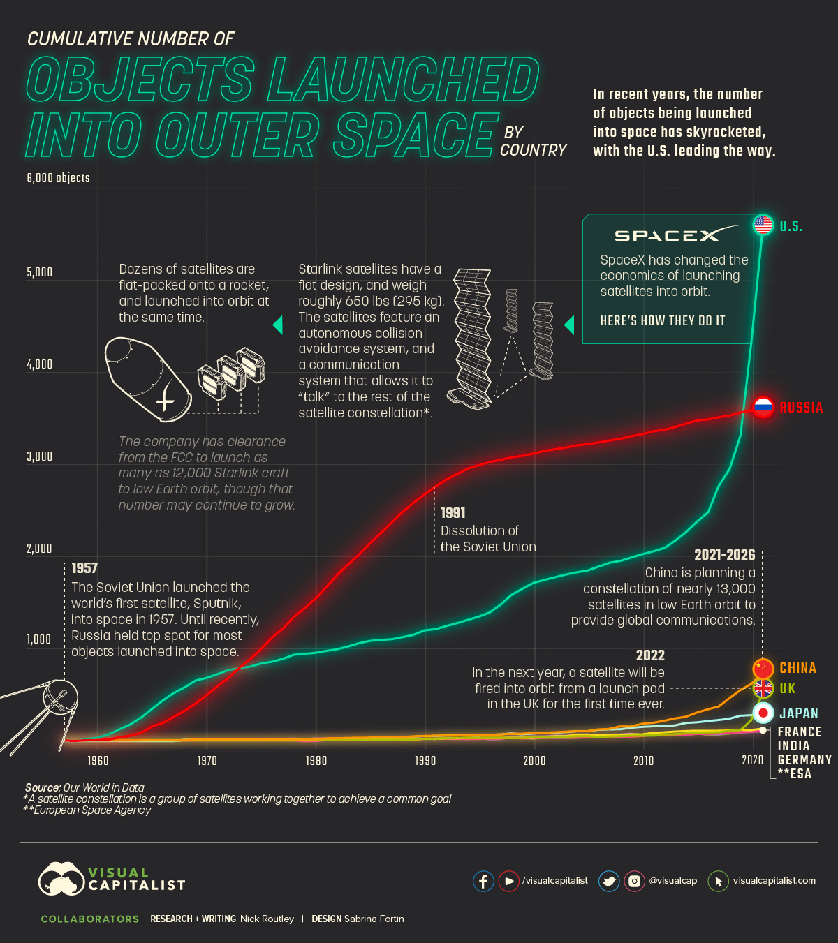 We are now in the second space race. It was estimated that the total space economy in 2022 was $549B and is expected to grow extremely quickly in the years to come. Led by the success of SpaceX and Blue Origin, the current space race is being led and dominated by American private companies. NASA is still important, but the bulk of funding for space in the last decade has come from private investors and not the government. This has given the U.S. a big advantage that the rest of the world is now trying to catch up with.